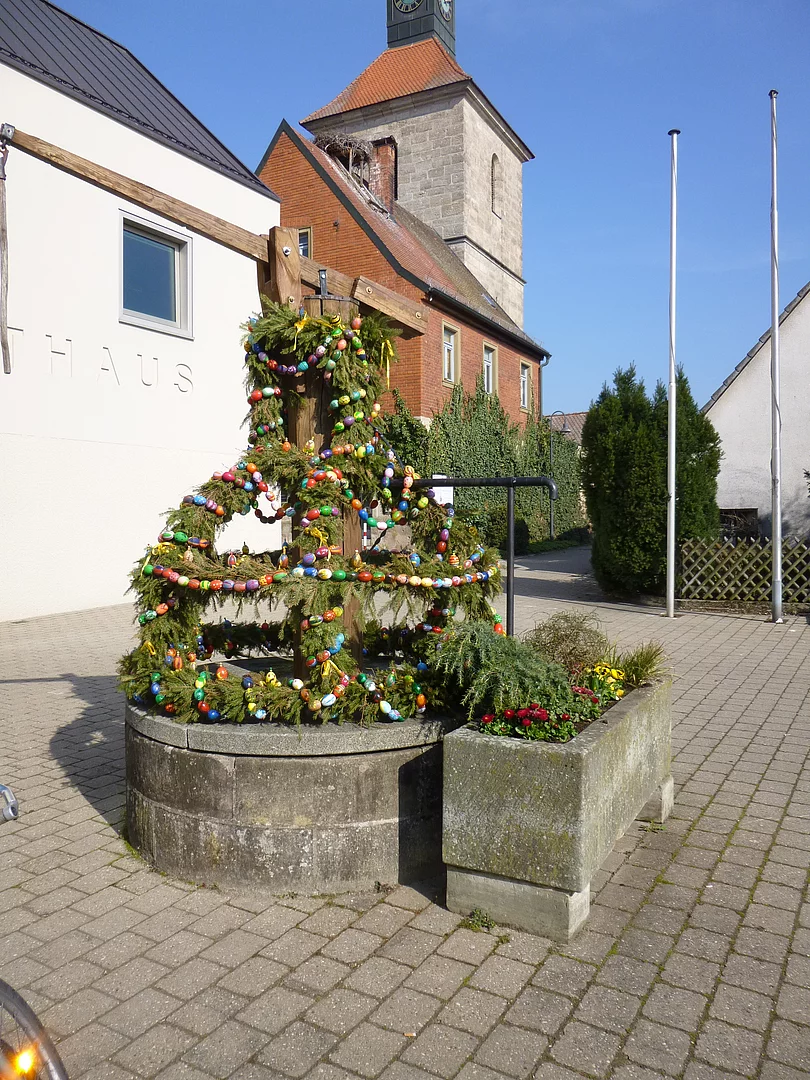 Zwischenzeitlich hat die Gemeinde Möhrendorf im Jahr 2011 an der Stelle des früheren Gasthauses Letsch das Neue Rathaus errichtet. Der Dorfbrunnen wird jährlich zu Ostern von freiwilligen Helferinnen und Helfen des "Frauenforums" liebevoll geschmückt (oberes Foto).