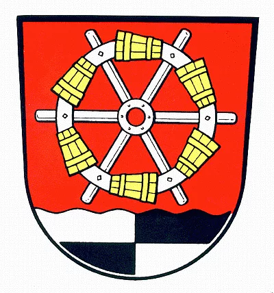 "Über von Silber und Schwarz geviertem Wellenschildfuß in Rot ein sechsspeichiges silbernes Wasserschöpfrad mit sechs goldenen Eimern ("Kümpfen")."