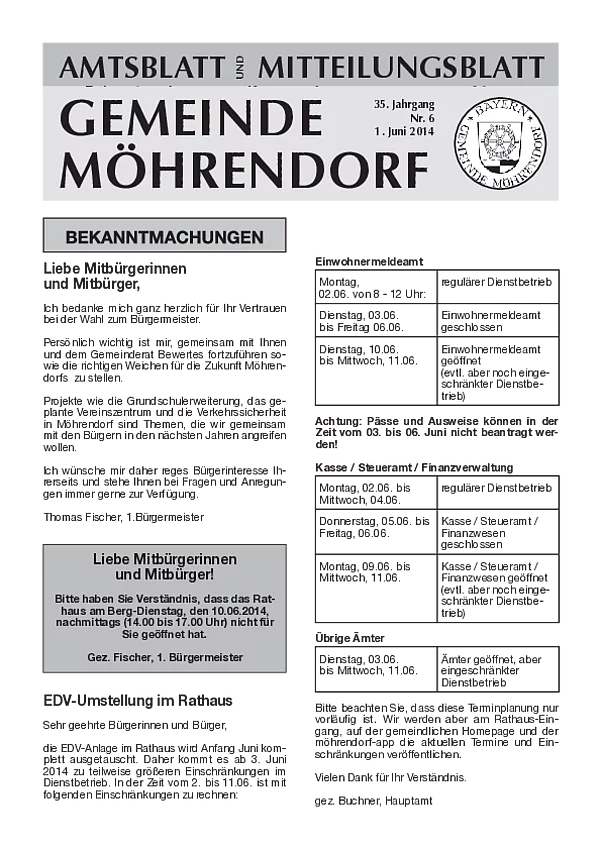 Anfang 2026 wurde aus dem bisherigen Amts- und Mitteilungsblatt das neue Info- und Mitteilungsblatt. Bis auf die Auslagerung der amtlichen Bekanntmachungen gibt es inhaltlich und an der monatlichen Erscheinungsweise keine Änderungen. Die amtlichen Bekanntmachungen erscheinen ab 01.01.2026 im neuen digitalen Amtsblatt.