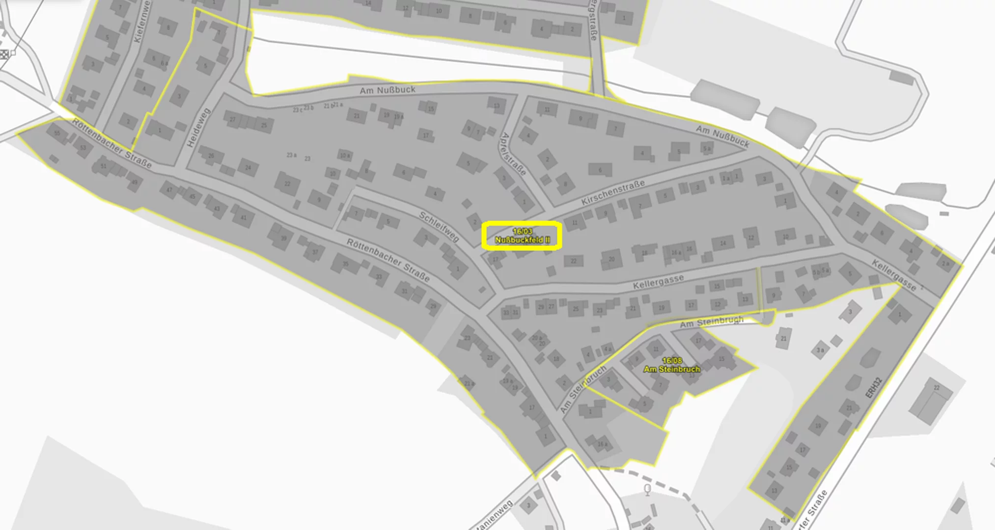 Der ursprüngliche Bebauungsplan 16/3 Nußbuckfeld aus den 70er Jahren wurde 2004 neu aufgestellt und bekam die Bezeichnung 16/3 Nußbuckfeld II. 2018 wurde der Bebauungsplan geändert und ist seitdem rechtskräftig.